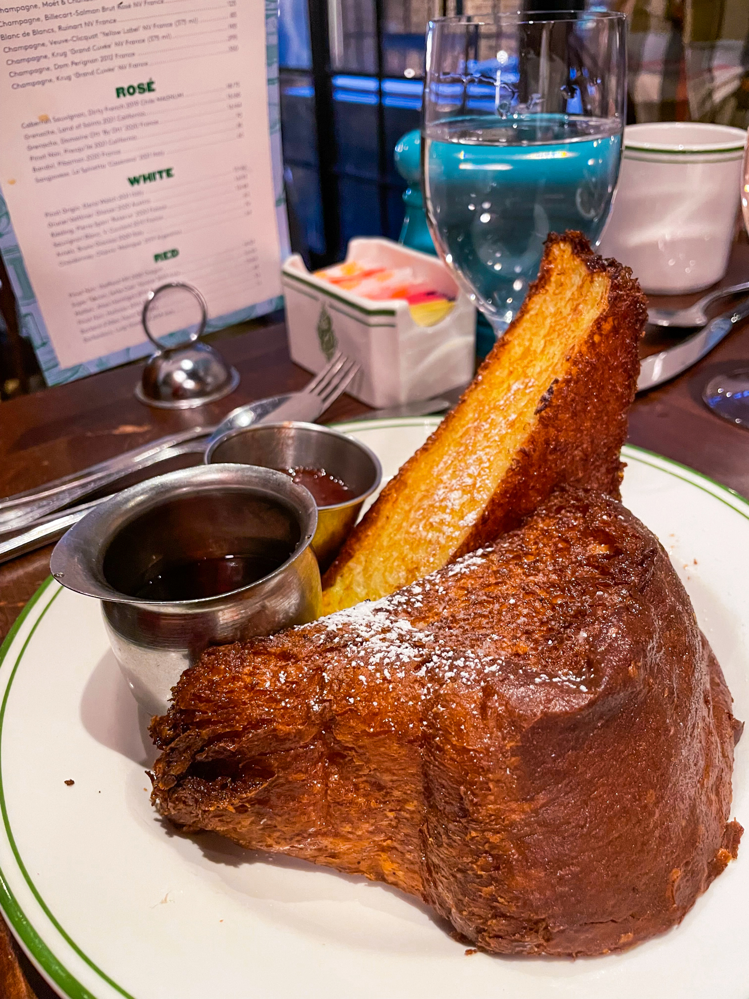 Short and sweet story: Circular Pain Perdu ($22+ tip/tax). With its breathtakingly soaring ceilings and moody sculptural lighting, Cathedrale is one of our favourite date night restaurants. It’s a place to visit when you want to impress. Cathedrale also offers brunch, albeit in an adjacent sunny atrium setting filled with leafy plants. Glazed with a citrus marmalade, its French Toast is cut into a thick circle, and is surrounded by a moat of maple syrup. It’s insanely sweet, and a decadent start to a New York weekend.