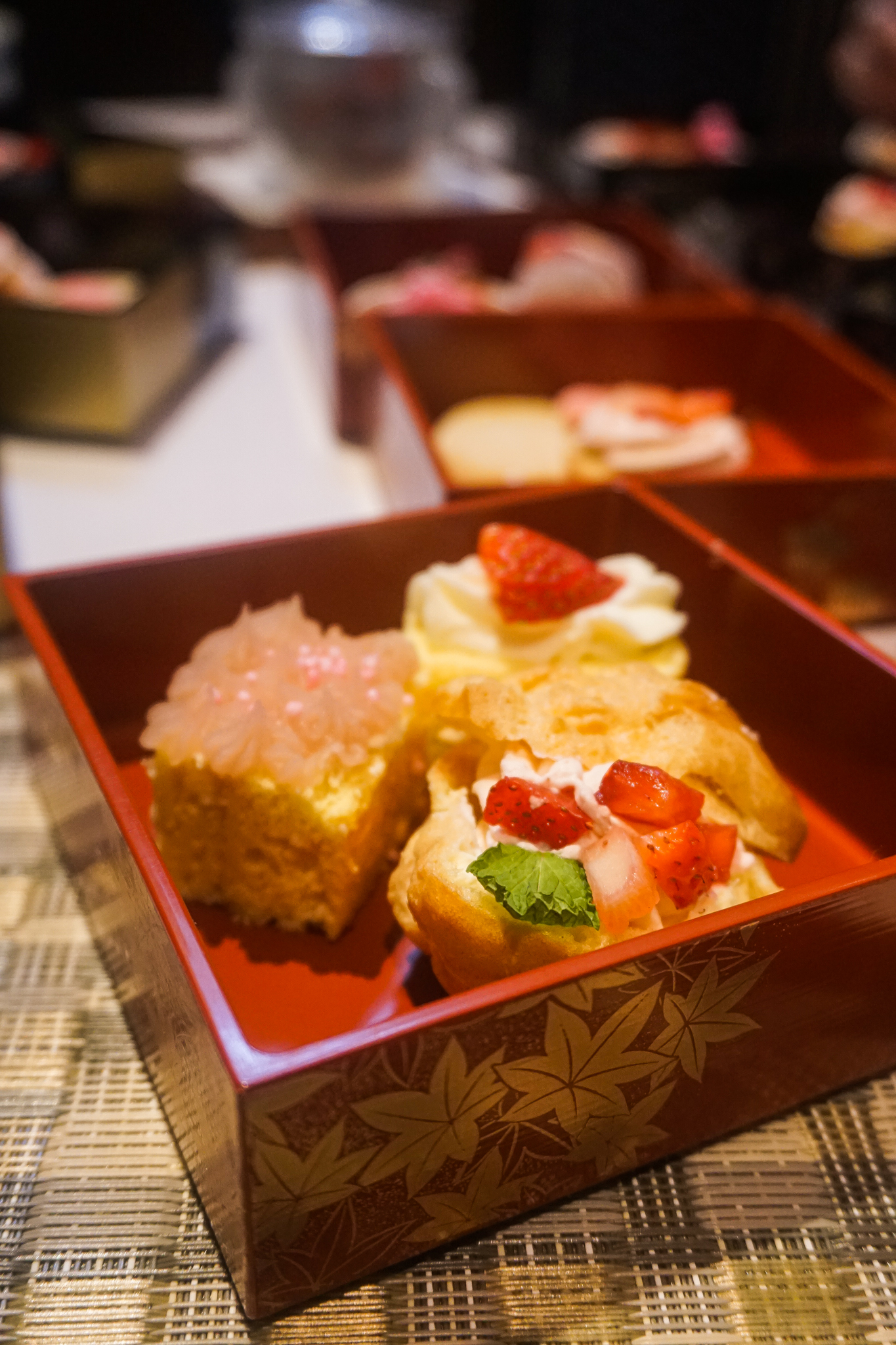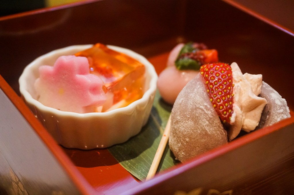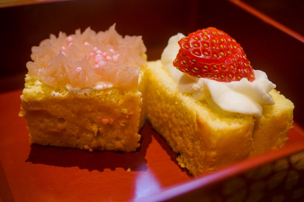 High tea takes place a floor above the tea house, and there are sittings on Friday and Sunday available throughout April and May. The tea on offer was a lightly-scented strawberry green tea, and the food service commenced with a tiered tower of savoury nibbles. These bites included open-faced sandwiches topped with coils of salmon and another smeared with sweet cream and embellished with strawberries. There were also inari sushi pillows jewelled with sliced tomatoes. The high tea stayed through to its Japanese roots in bypassing English scones, and with the dessert portion being presented in three beautifully-lacquered boxes. The desserts included sponge cakes layered with sakura paste, cream and strawberry slices, a puffy choux pastry, mochi desserts in the form of a ball, as well as skewered as dango, and a selection of butter biscuits.