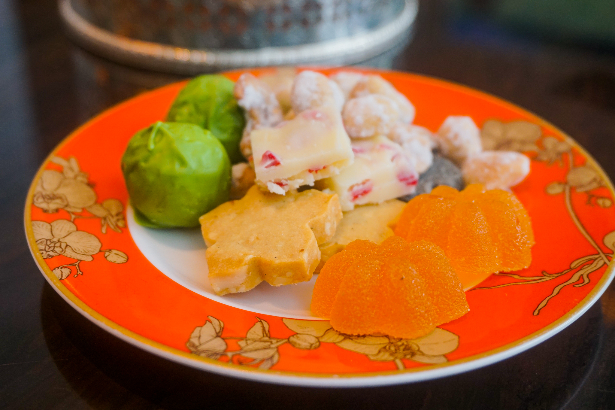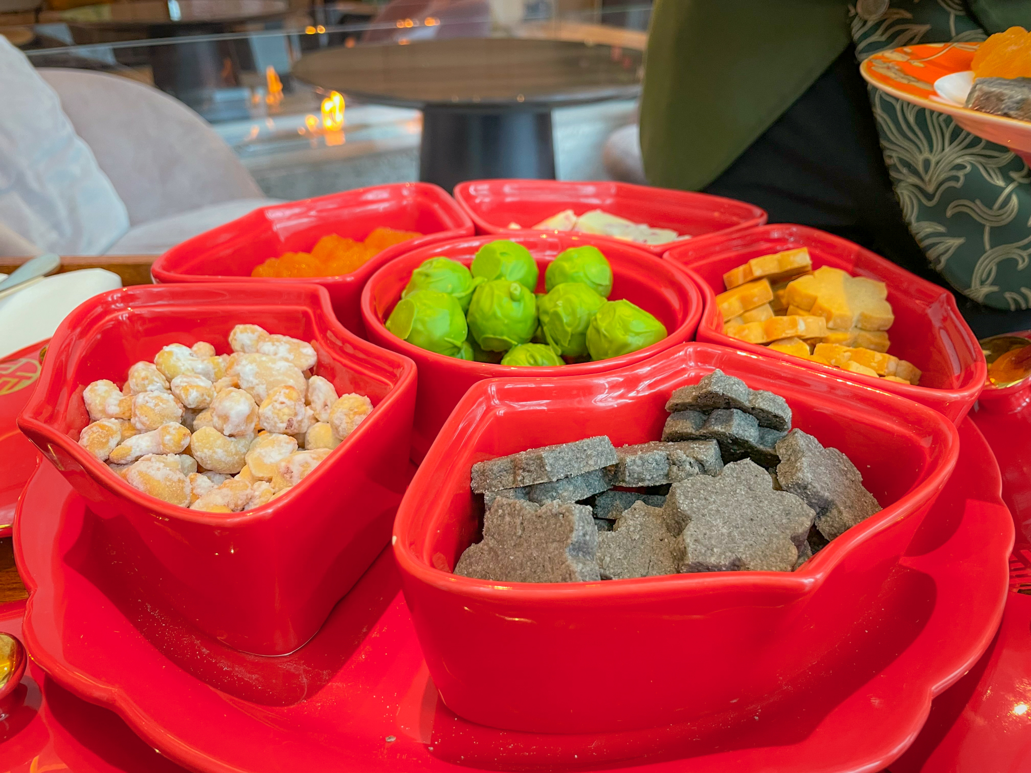 The hotel ordinarily offers an Asian-themed afternoon tea. During our visit in the last days of March, the Pan Pacific was still offering its Lunar New York afternoon tea menu. The savouries were sadly, somewhat disappointing, comprising a short kaya toast tower sandwiching a thick unmelted round of butter, and four pastry cups filled with cold shredded duck meat, cold soba noodles, and cold crispy tofu. Cold/room-temperature does not really work for Asian food…except for maybe sushi or Thai salads. Instead of scones, we received a platter of traditional Chinese sweets from the “Prosperity Box“, such as candied nuts, jujubes, crackers, shortbread and matcha chocolates.