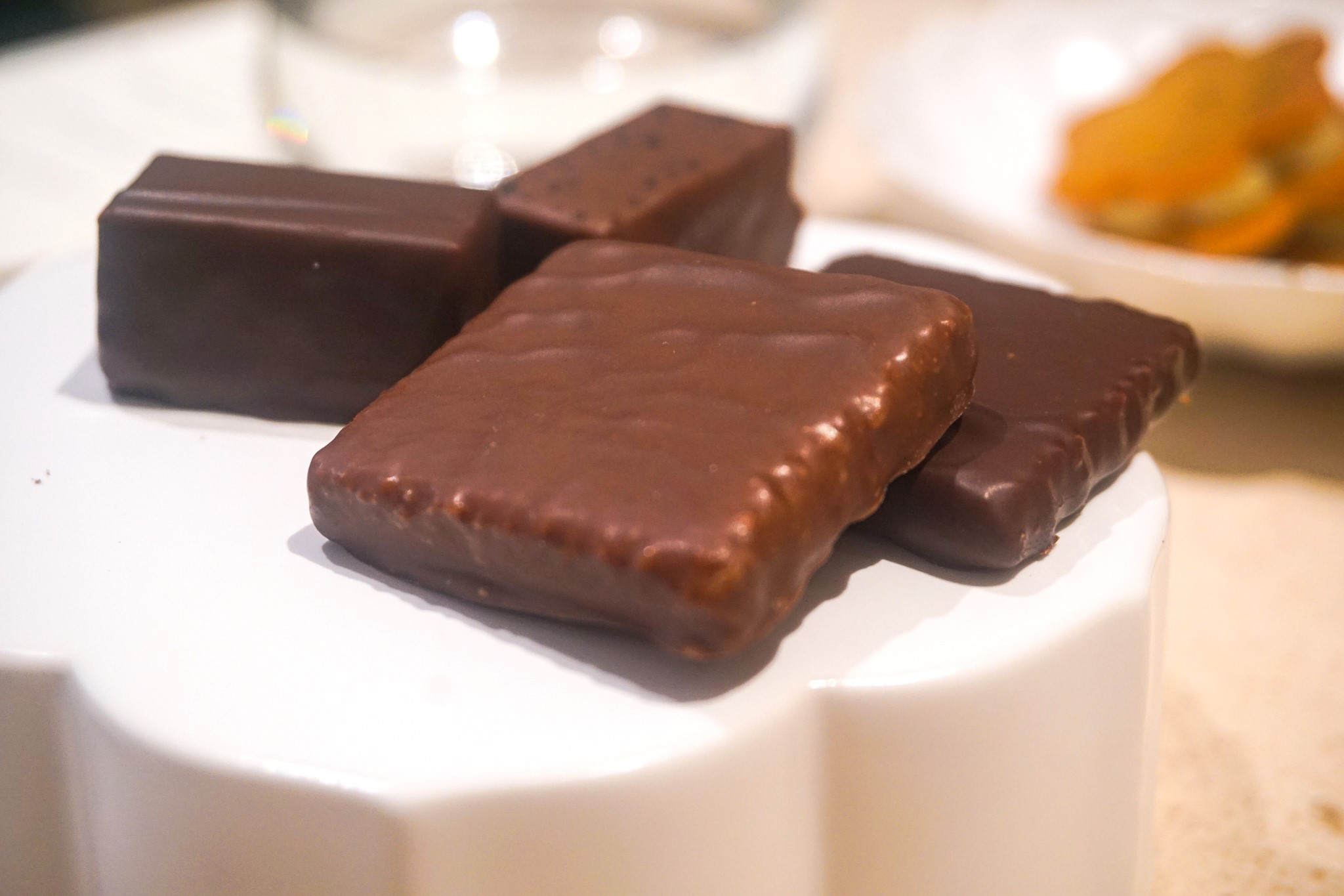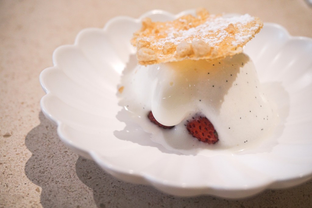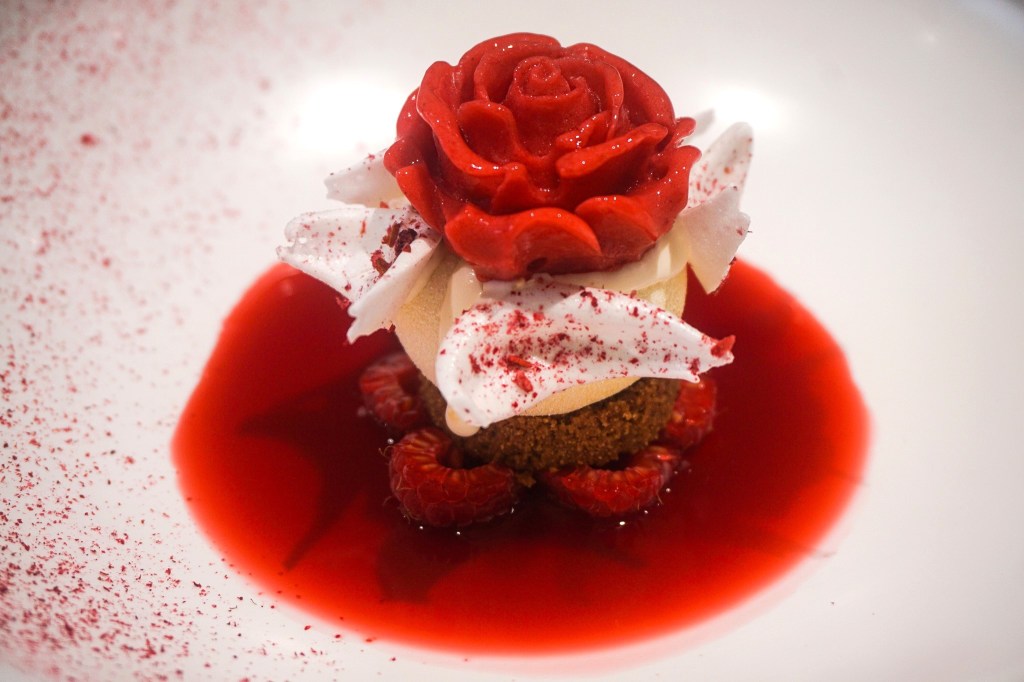In late April, Lysée collaborated with a French chocolatier, Aurelien Rivoire, to bring a 5-course dessert degustation to NYC. The experience took place in the ground floor sitting area of Lysée, which has a very minimalist, blond wood aesthetic. It started with a palate cleanser beverage: the ombre-coloured “Yuja Sunrise” was a green sencha tea base enlivened with “yuja” (the Korean equivalent of the Japanese yuzu). The first dessert course — the “Nuage de lait” — saw strawberries flown in from Spain being swirled into a milky foam and ice cream concoction. The second course was the most exquisitely plated dessert that we have seen in a long time: anchored by a base composed of a circle of raspberries, a feuilletine biscuit, and an orb of black pepper mousse, raspberry sorbet was crafted into a beautiful rose to make the “Raspberry Vacherin.” As the third course, the “Butternut” was a heftier dessert, featuring small chunks of butternut squash, vanilla ice cream and panettone mousse. The epilogue consisted of an assortment of chocolate nibbles and flower-shaped shortbread cookies sandwiching a ganache infused with Korean sejak tea. The latter can be purchased in the patisserie itself, and is something that would make a wonderful gift.