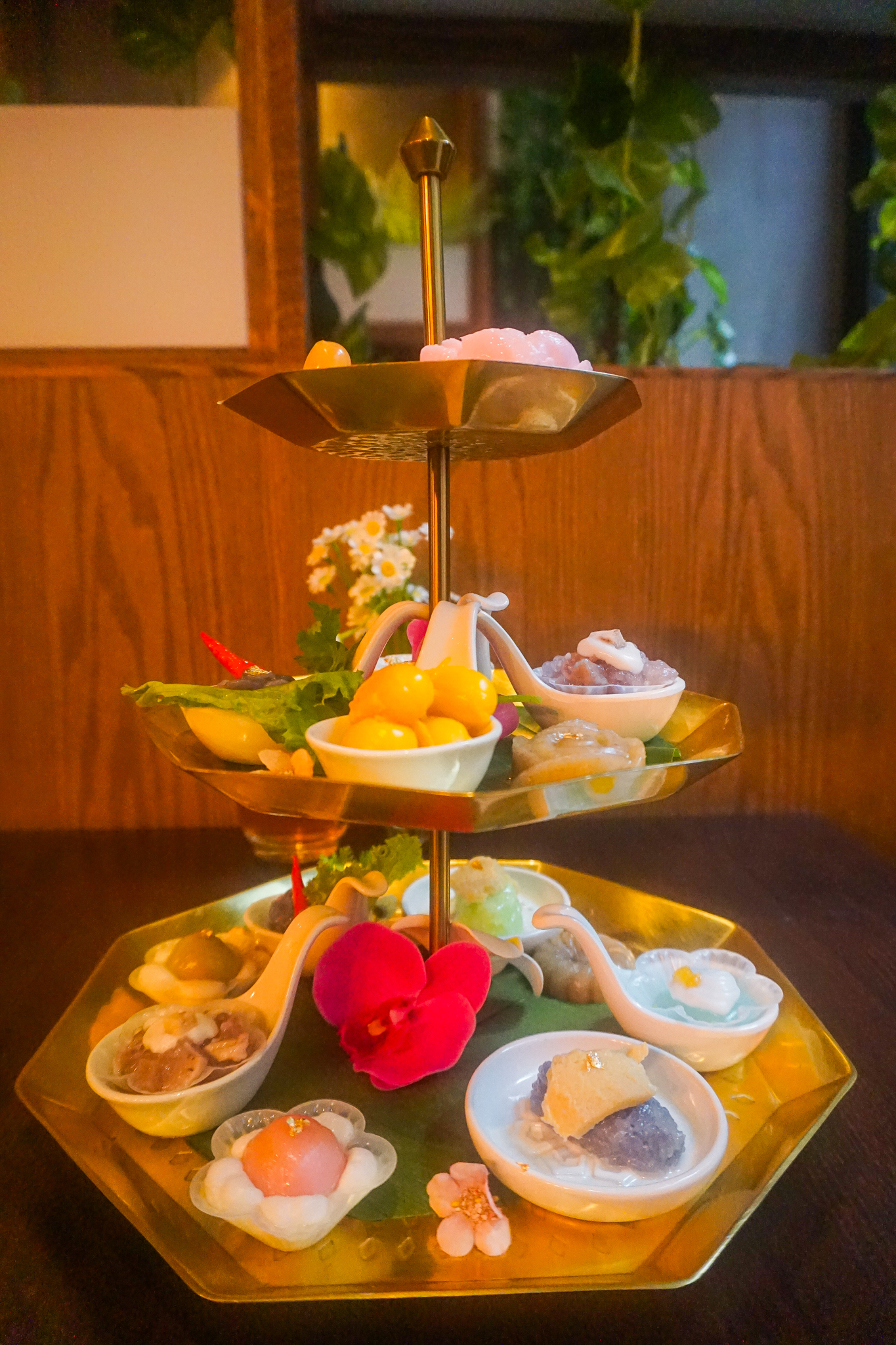 Sarisa Dessert Cafe is located a floor above street level at the edge of Midtown Manhattan, in a calming space filled with leafy plants and plush velvet seating. The menu features a wide selection of colourful Thai desserts, with a handful available only on certain days of the week. High tea itself is offered only on the weekends, and is priced at $65 for two (plus tax/tip). It commences with tea being served in a clear glass pot, with a blooming flower unfurling within.