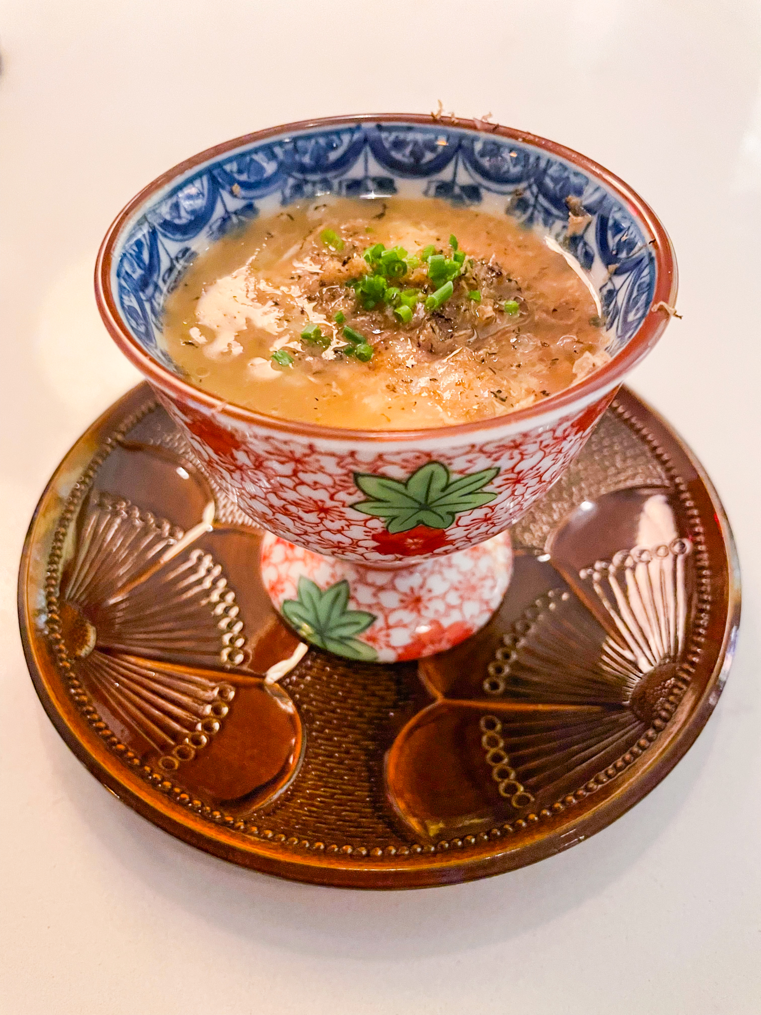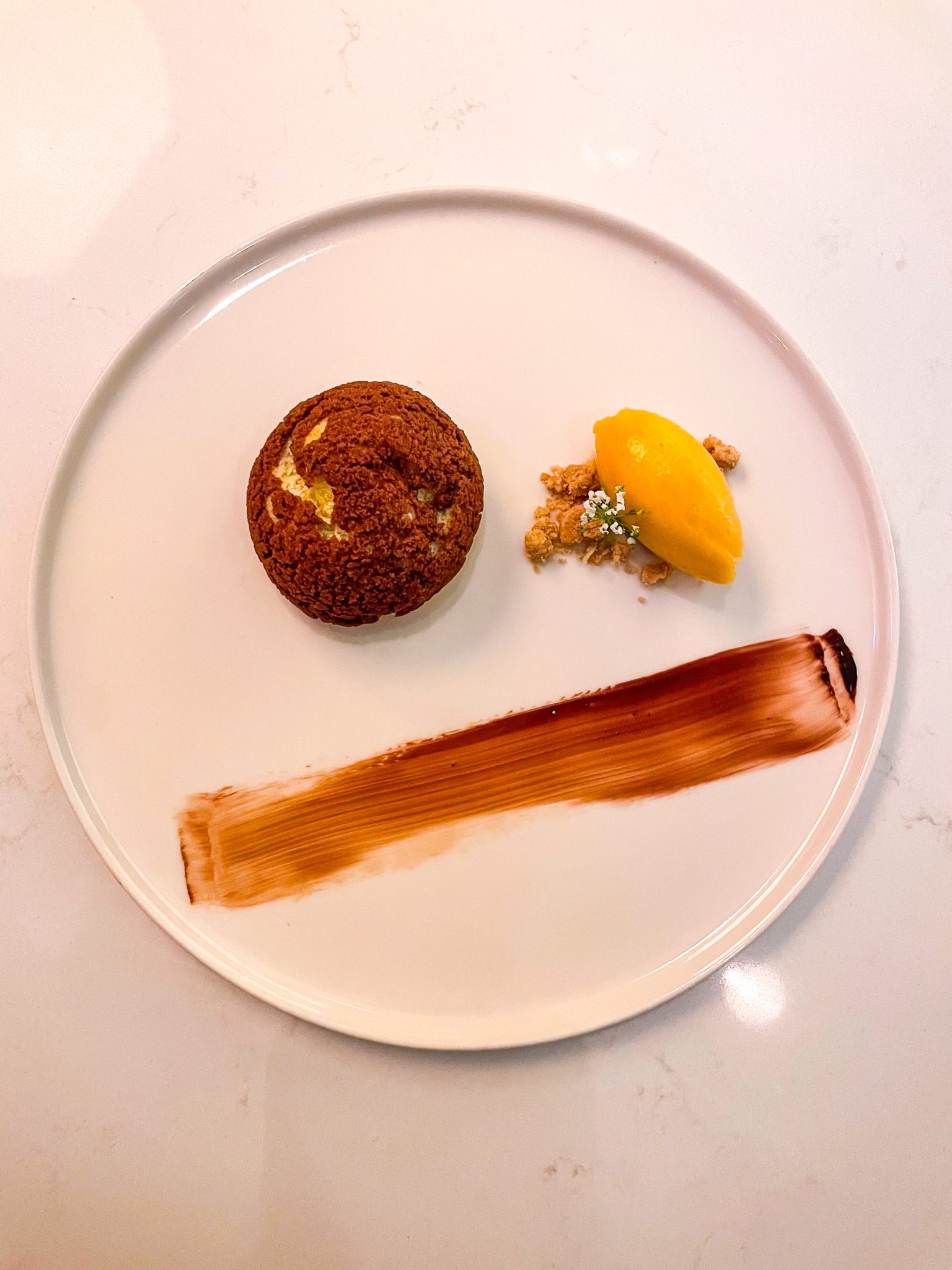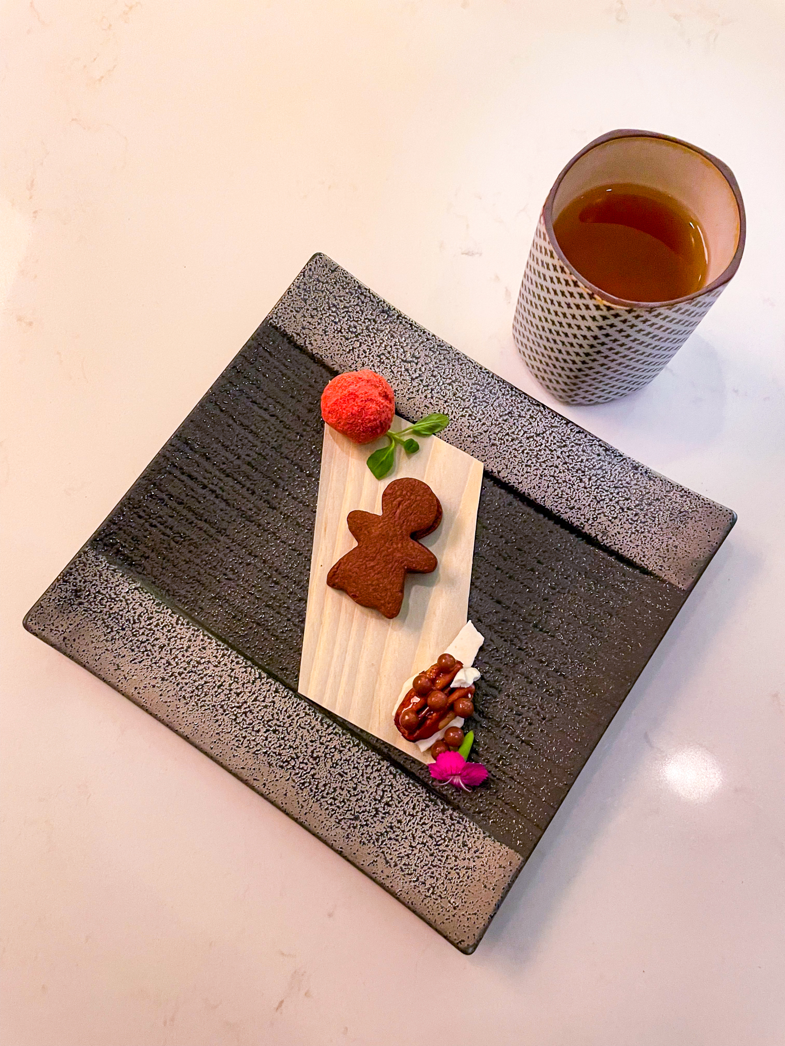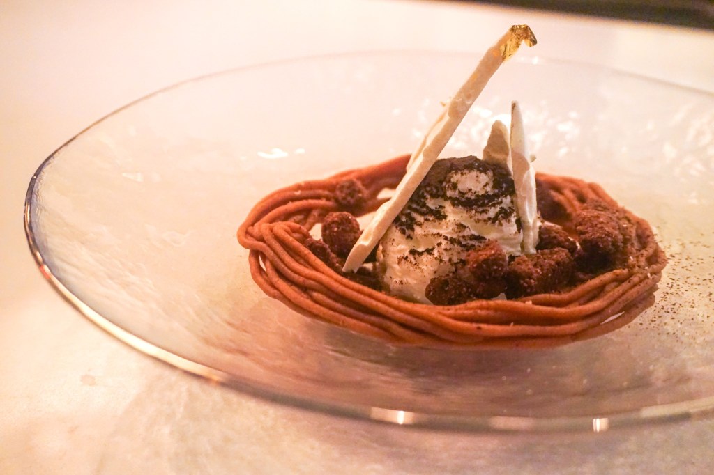 Held once (sometimes twice) a month, Momoya Soho’s “dessert omakase” requires at least a month of advance reservations. You may recall Momoya Soho from one of our previous round-up list of NYC’s Best Restaurant Desserts. See here for that review. Although its Tiktok-famous giant parfait dessert doesn’t make an appearance at the dessert omakase, the experience features six other dessert courses. On our visit, the degustation commenced with a somewhat polarizing palate cleanser bite of foie gras and red bean sandwiched between crunchy toast. This was followed by a succession of dessert courses including: (i) a delicately-crafted Oishii strawberry cream parfait (probably our favourite dessert); (ii) two wagashi (one of which stands out in our memory as a vibrant yuzu-infused morsel); (iii) a tight circle of caramelized apple to form a tarte tatin; (iv) a swirl of chestnut cream and hojicha meringue; (v) a cream puff that yielded an exuberantly rich chocolate centre; and (vi) a platter of three mignardises, consisting of a caramelized pecan, shortbread gingerbread man cookie, and strawberry chocolate truffle. About halfway through, a French onion-style soup was served in a little porcelain crucible.
