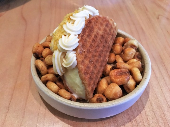 Short and sweet story: Since the city sprung back to life in 2022-2023, there has been a tsunami of Korean restaurants popping up. Two of the best ones on the casual end of the dining spectrum are Moono and Ariari. Moono’s corn creme brulee errs more to the traditional side, with a quenelle of burdock ice cream. Ariari’s version is sweeter, with corn nuggets embedded within and shavings of white chocolate gracing the surface. Check out our round-up review of both of these spots (and other excellent modern Korean restaurant desserts) here and here.