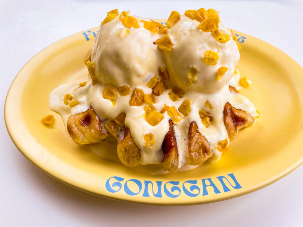 Short and sweet story: Gonggan is one of the most creative dessert spots in NYC, it’s just a pity that it is all the way in Flushing, which is about 1.5 hours away by train from our Brooklyn Heights neighbourhood. 😦 Otherwise, you would likely find us there every weekend. 😀 Gonggan specializes in especially kooky-looking dessert creations (look out for a forthcoming review), but we actually think that the best desserts at Gonggan are not the ones that have generated a billion Tiktok videos. Bypass those, and focus instead on the variety of croissants or croffles on offer. Of the latter, don’t miss the corn croffle that is smothered with two giant orbs of corn ice cream resembling a melting rotund snowman. Yes, it’s looks absolutely crazy, but it is many degrees less sweet than we thought it would be, and a thousand degrees more rave-worthy than we anticipated.