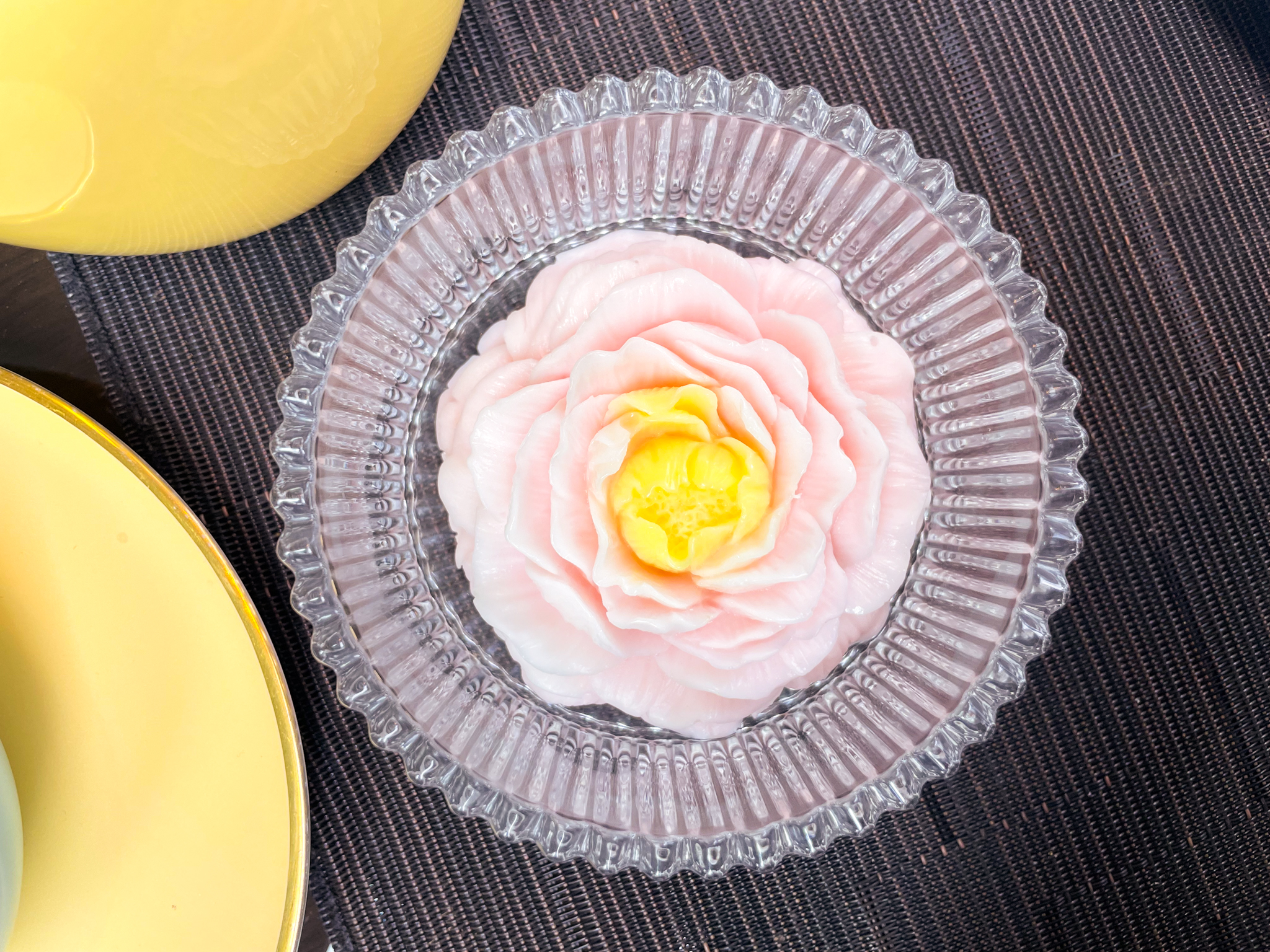 The piece-de-resistance of the afternoon tea at the St Regis was, without a doubt, the 7-dessert course…for one person. 😀 The first tier of desserts were crafted in a lighter style and included: a red choux pastry puff filled with hazelnut cream, a mango sago creation shaped as a gold ingot, and a Japanese-esque style cheese tart inflected with Earl Grey flavours. Consisting of a trio of finely sculpted trompe l’oeil desserts, the upper level of desserts included: a “Bonsai Tree” (a vanilla and green tea sponge in a chocolate pot); a “Mandarin Tree” (a rich dark chocolate mousse cake surrounding a mandarine compote heart); and a “Money Bag” cake (with a creative interplay between chocolate, pistachio and raspberry). And the final palate cleansing dessert was a large peony-like coconut jelly flower. It reminded us of the desserts we had last year at NYC’s Sarisa Cafe.