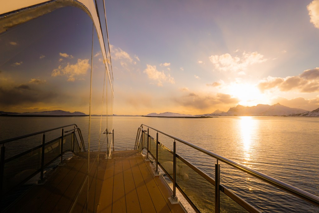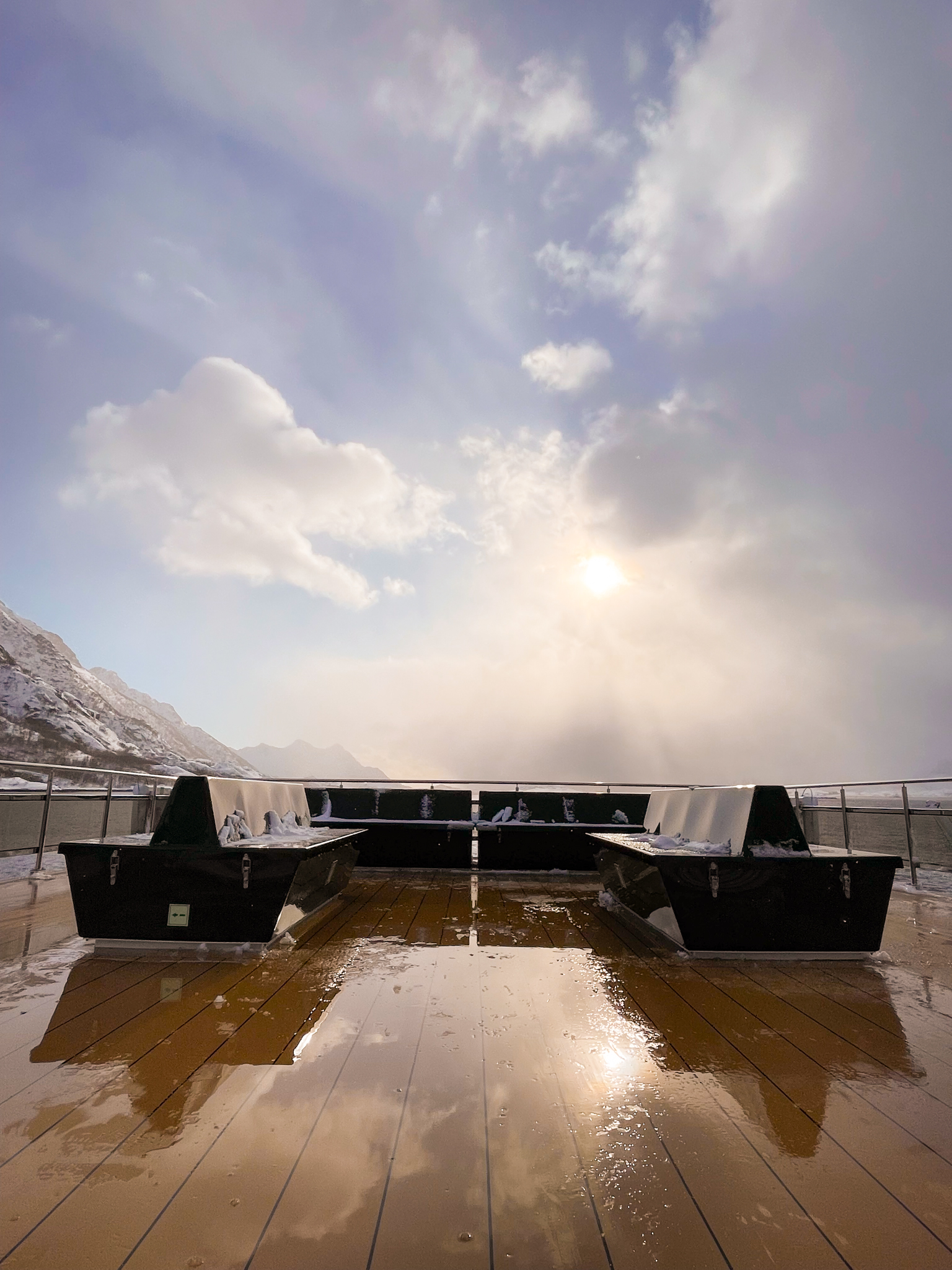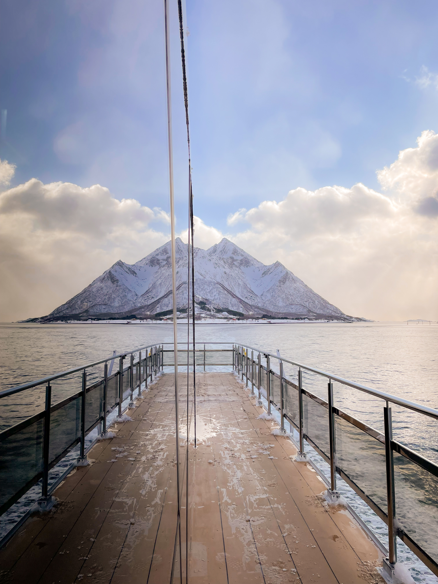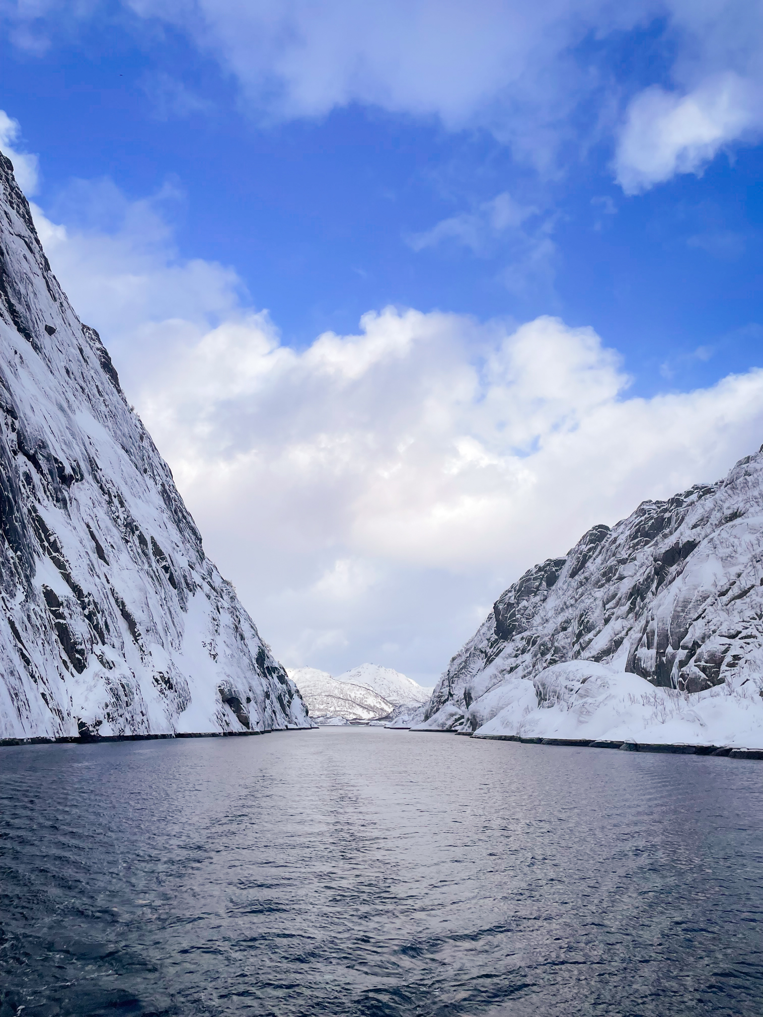 What to do if a snow blizzard has ruined your plans for a road trip or other activity? Take a cruise. A mega snow blizzard caused all the roads to the blocked on one of the days we were in the Lofoten Islands, and as a consequence, many tour activities were cancelled. The only activity in operation was a cruise through the fjords. Not wanting to be trapped inside the hotel room more than necessary, we took the afternoon cruise. The boat skirted along the coastline and into Trollfjord, a fjord supposedly famed for its narrow 100 metres opening. In truth, the fjord itself was underwhelming to us — if you want a really narrow fjord, cruise the fjords along China’s Yangtze River. But the boat ride to and from Trollfjord was spectacular, lined with majestic snowy mountains and a horizon that glistened amber and platinum in the setting sunlight.