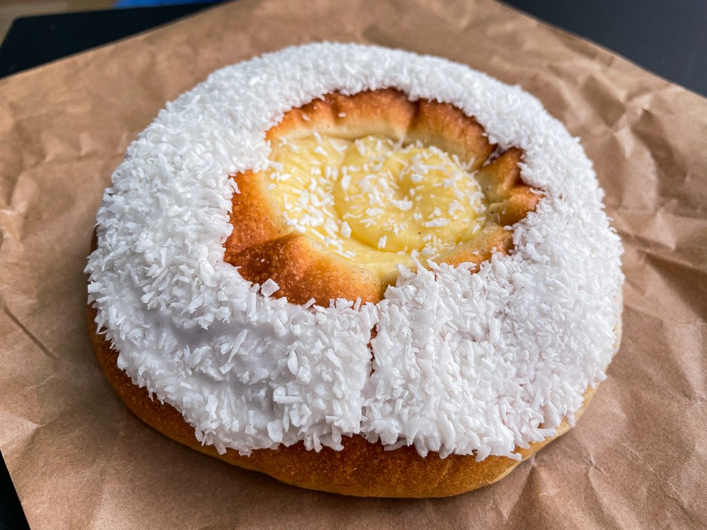 Although we did not visit Norway for its food, as dessert bloggers, we of course tried to find some local dessert delicacies to sample. 🙂 Of all the sweet treats we tried in Tromso and Svolaer, the one that stands out is the Norwegian “skolebrød.” It is a soft bun, lightly scented with cardamom, filled with custard and encircled by dessicated coconut flakes. There’s something very interesting about eating – in a country covered in ice and snow – a bun rimmed with dried fruit typically from an equatorial country basking in tropical heat .