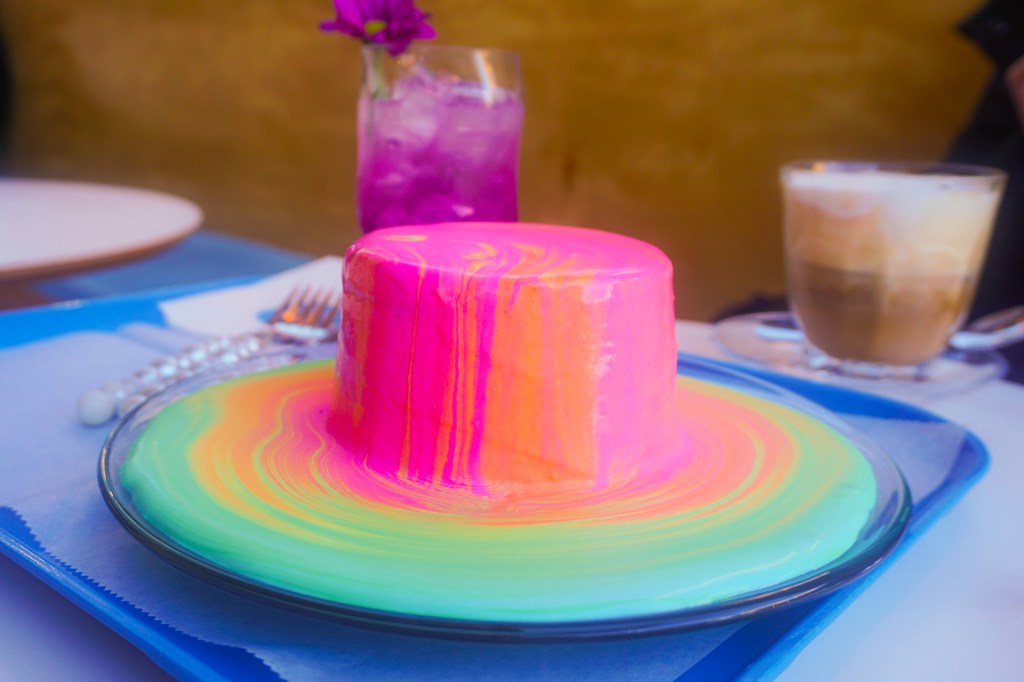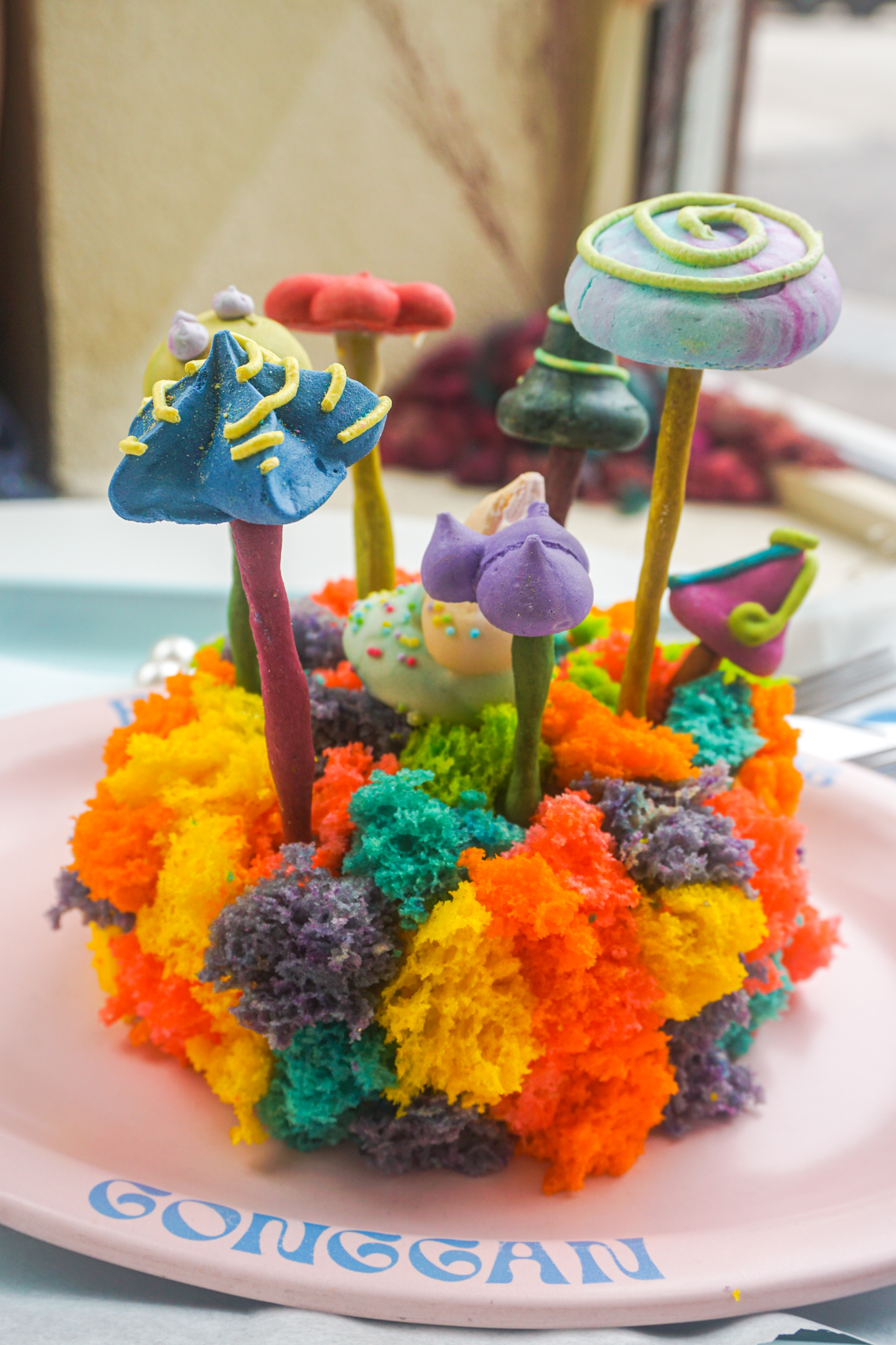 Short and sweet story: Just a year ago, we were yawning over the city’s seemingly never-ending obsession with croissants and other same-same-same bakery treats. Then, Gonggan opened up. If you appreciate creativity over traditionalism, and/or if you like your desserts not too sweet, this modern Korean dessert cafe is made for you. On your first visit, you will probably order the viral “Rainbow Cake” ($19) that sees a pot of rainbow cream playfully spilled into a pool over a barely-baked cake base, or the “Sweet Potato Cake” ($19) that seems as though it has been shovelled out from a rainforest, resplendent with colourful moss and meringue mushrooms. We actually love more, Gonggan’s numerous colourful drinks, and its giant croissants and croffles ($16), especially those featuring Korean flavours such as yakgwa, corn, injeolmi, mugwort etc. Each dessert is oversized, so definitely bring at least one friend along.