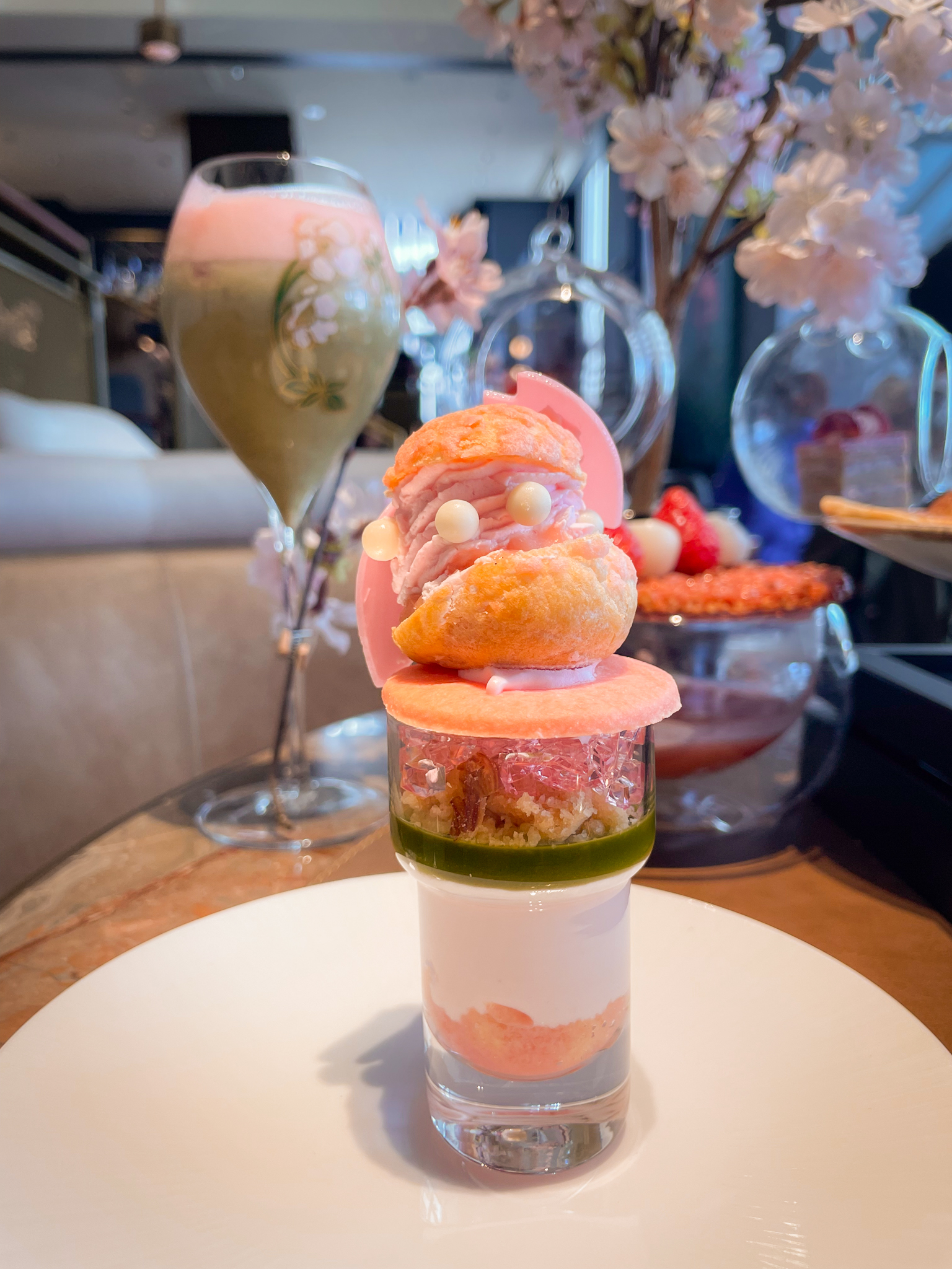 Short and sweet story: A 10-minute walk from the west side of the gigantic Shinjuku station, the Kimpton Shinjuku Hotel offers a refreshing respite from the pandemonium. High tea here is taken in a more casual setting, where you will find office workers mingling with hotel guests. Instead of bite-sized savouries, we first ploughed through a salad course and then had a choice of main dishes, such as a hearty chicken, sirlion steak, or fish course, or more typical brunch fare such as French Toast and Eggs Benedict. The highlight of the Kimpton’s high tea was, of course, the incredible array of cherry blossoms-themed desserts. These were framed by an elegant branch of blossoms and also partly presented on a glass tray box resembling a Japanese-style garden. The desserts included sakura-flavoured mont blanc, daifuku, parfait, brownie, taiyaki, and a macaron. There was also a bowl of sakura zenzai (a watery soup traditionally made of azuki beans) with a skewer of dango mochi balls and strawberry slices. We barely finished all as they were very generously sized. The Kimpton’s high tea was also accompanied by a delicately-fragranced sakura matcha mocktail beverage.