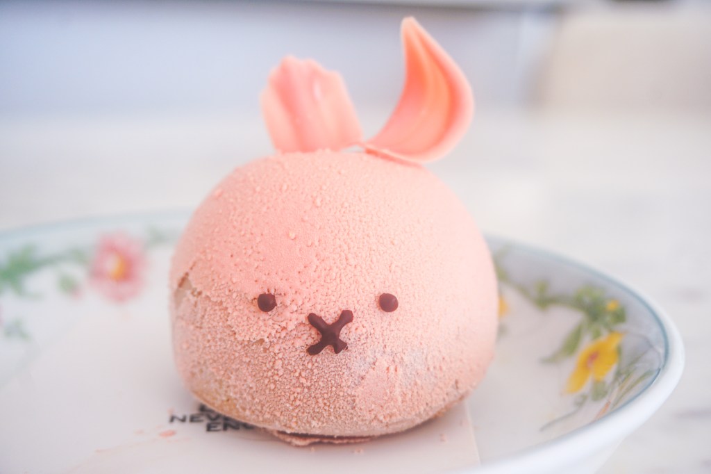 Short and sweet story: We have nibbled through a lot of mousse cakes over the years, from Melbourne to London to NYC and elsewhere. From those painted over with a starry galaxy glaze, to those shaped like a trompe-l’oeil fruit, one can be fairly imaginative with crafting mousse cakes. Outside of the Melbourne CBD, we love the character mousse cakes from Linger Cafe, and inside the CBD, the only place where we have spotted character mousse cakes has been at Sulwha. Here, there’s a either a bear or a rabbit mousse cake. The rabbit is simply adorable, blushing in cherry blossom pink, and possessing an inner heart of chocolate and raspberry.