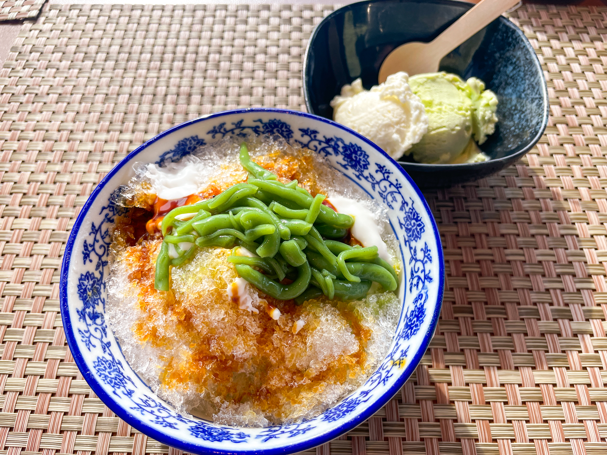Short and sweet story: Long-time readers of this dessert blog know that we love pandan desserts — our guide to the best pandan desserts in NYC remains one of our most-read dessert reviews. So you can of course imagine that the moment we heard of a pandan-themed afternoon tea in Hong Kong, we immediately reserved a table. The hotel where this themed afternoon tea was held was the Hyatt Centric, over in the far eastern side of Hong Kong Island. Offering a bright north-western view of the harbour, the hotel buzzed with a predominantly expatriate lunch crowd. As for the high tea itself, soporific ribbon sandwiches were thoughtfully replaced with a quartet of savouries inspired by South-East Asian flavours other than pandan. For example, there was a tartlet of beetroot and thail basil mousse; a lettuce-wrapped crispy prawn; a spoonful of crab salad spread on tapioca crackers; and triangles of pandan kaya toast to be dipped in a slightly sweet/slightly salty concoction of egg and soy sauce. The dessert offerings that afternoon leaned sweeter than the average local HK palate would likely prefer — we however loved all of the pandan components, which included an ondeh ondeh sponge cake bisected with dessicated caramelized coconut; another pandan cake decorated with shards of mango and pomelo sitting on mango sticky rice-scented cream; and a chewy mochi ondeh ball of pandan and coconut. Other dessert items that did not follow the pandan theme included a kaffir lime pavlova, and an exuberantly rich, chocolate-filled dessert taco creation. To top it all off, there was also an “all you can eat” ice cream and shaved ice station. From here, we could only fit in a bowl of cendol, and two scoops of pandan and coconut ice cream.