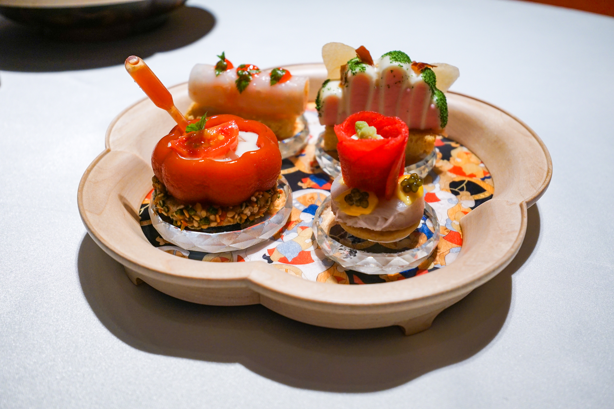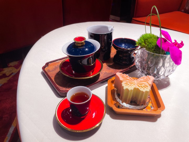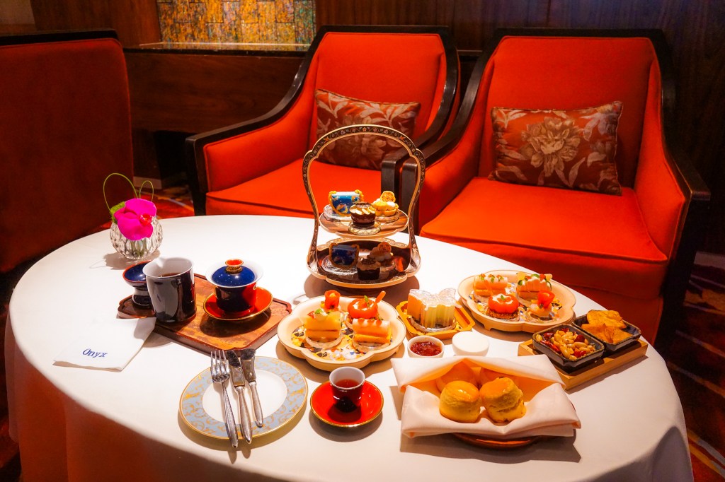 Located in the Futian district near the high-speed rail station, the RitzCarlton hotel offers a very thoughtful modern fusion high tea. During our visit, high tea was taken in the lobby lounge area, and commenced with a platter of savouries served on a peach blossom-shaped dish. There were no soporific ribbon sandwiches in sight. Instead, there were four eye-catching savouries, including gazpacho and celery root puree piped into a trompe l’oeil tomato jelly; yellowtail, red radish and caviar shaped into a budding red flower; ham mousse and honeydrew rolled into a log; and a fan-shaped creation of shrimp roulade and herbs. The exquisitely-curated Chinese tea menu along with the desserts, of course, were the twin highlights of the afternoon tea — arriving on a cloisonne porcelain high tea stand, the desserts were crafted in the French style, with two injected with touches of Chinese flavours. Of the latter, there was an ethereal lychee mousse cake shaped into a butterfly, and layered within with strawberry jasmine cremeux and pistachio sponge cake; and a miniature tartle with a caramelized peanut base and oolong tea cream piped on its surface. More Western-leaning in flavour profile were the blueberry cake crafted into the shape of a hand bag, and a very rich dark chocolate early grey mousse cake enlivened with spiced mango compote. Scones were also served, albeit in the English style with strawberry jam and clotted cream.