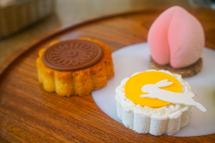With a string quartet playing throughout the afternoon, Island Shangri La’s afternoon tea makes for a very relaxing experience. On our visit, the hotel crafted a specially-themed mooncake afternoon tea, comprising three savoury bites and three sweet nibbles. Of the former, a neon-orange egg yolk was dropped onto a piece of circular bread and sprinkled with caviar, a spoonful of prawn, avocado and pomelo was nestled within a taco-like creation, and a large quenelle of foie gras was disguised as a trompe l’oeil peach.