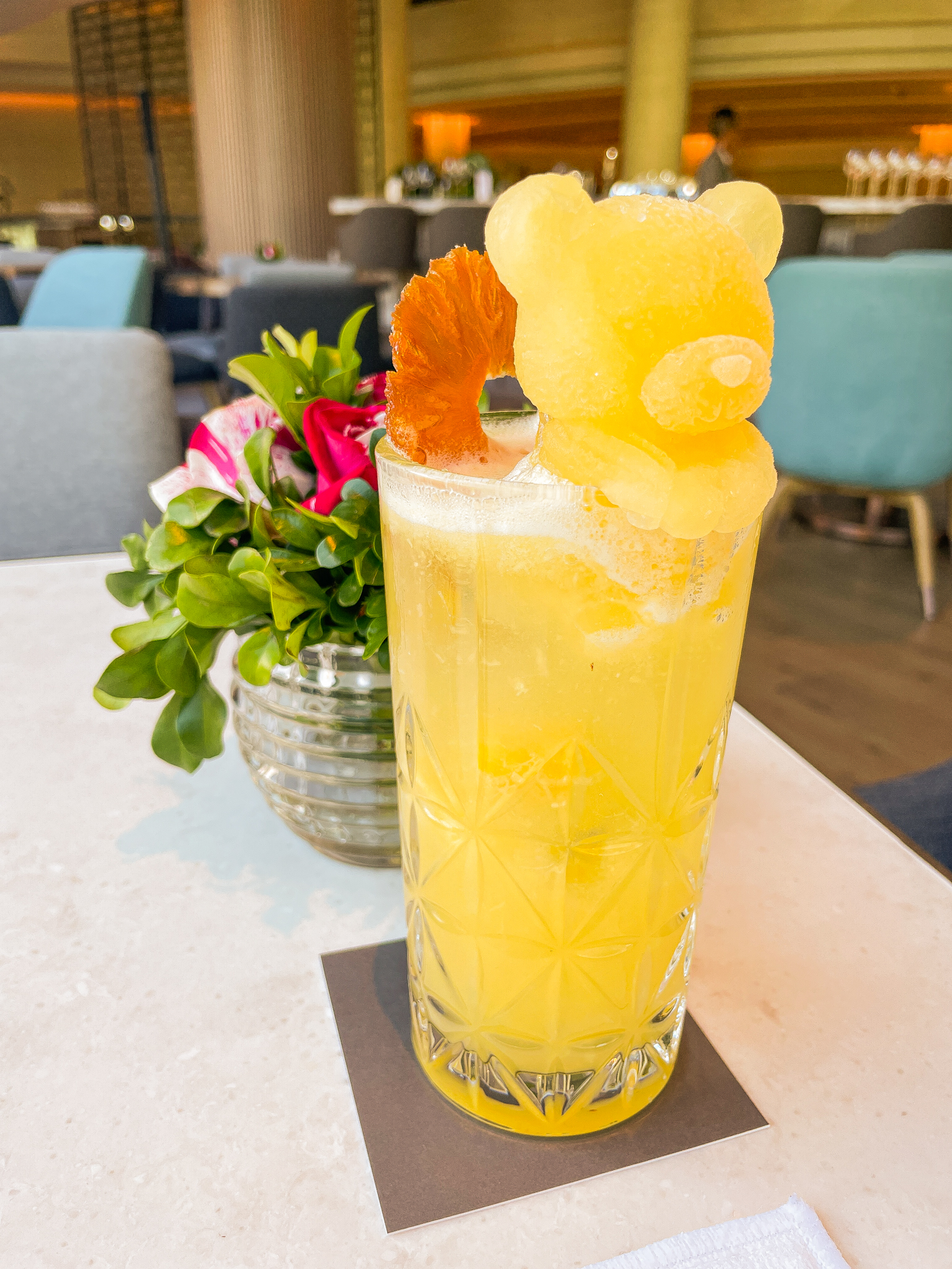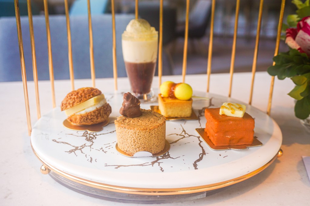 Short and sweet story: Cha chaan tengs — those curious relics of the British colonialist era that are cafe, restaurant and diner all mashed up together into one — were never our cup of tea. So many years later, they continue to diminish in number. Regardless of whether the characteristic rough-and-tumble ambience of a cha chaan teng is to our liking, one cannot overlook their influence on churning out several of Hong Kong’s most iconic desserts. A recent visit to the New World Millenium Hotel saw typical cha chaan teng dishes reimagined as an afternoon tea, presented on a gilded half-bird cage by way of five savoury bites and five sweet nibbles. The savouries included nods to both Guangdong culinary fare (e.g. abalone tart and transculent dumpling) as well as British morsels (e.g. chicken pie, egg sandwich). There was also a small bowl of pork skin and squid curry into which we dipped some chunky sweet potato scones. More memorable were the desserts, the majority of which were crafted in a creative trompe l’oeil style. For example, a puff pastry was bisected with pineapple passionfruit fruit cream and a slab of butter to resemble HK’s iconic pineapple bun, while a miniature skewer of curry fishballs was actually a yuzu mousse cake, and a miniature milkshake was in fact a parfait of red bean layered with coconut jelly. Additionally, whereas a pound cake was slathered on with a curious orange-brown icing to take on the appearance of French Toast, the last dessert of the afternoon tea was not only perhaps the most memorable in terms of taste, but also the most simple in conception and presentation — being, a roll cake wrapped in soft Hong Kong milk tea tones. Equally memorable were the evocative beverages – instead of tea, we chose a tall glass of pineapple yakult soda in which an ice bear floated. There was also traditional Hong Kong milk tea on offer, as well as a coffee swirled with peanut butter and condensed milk.