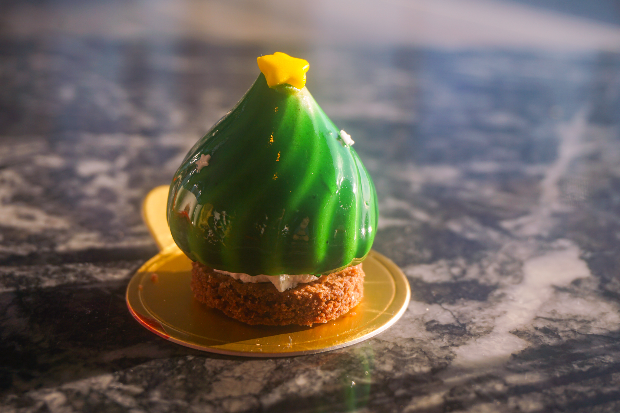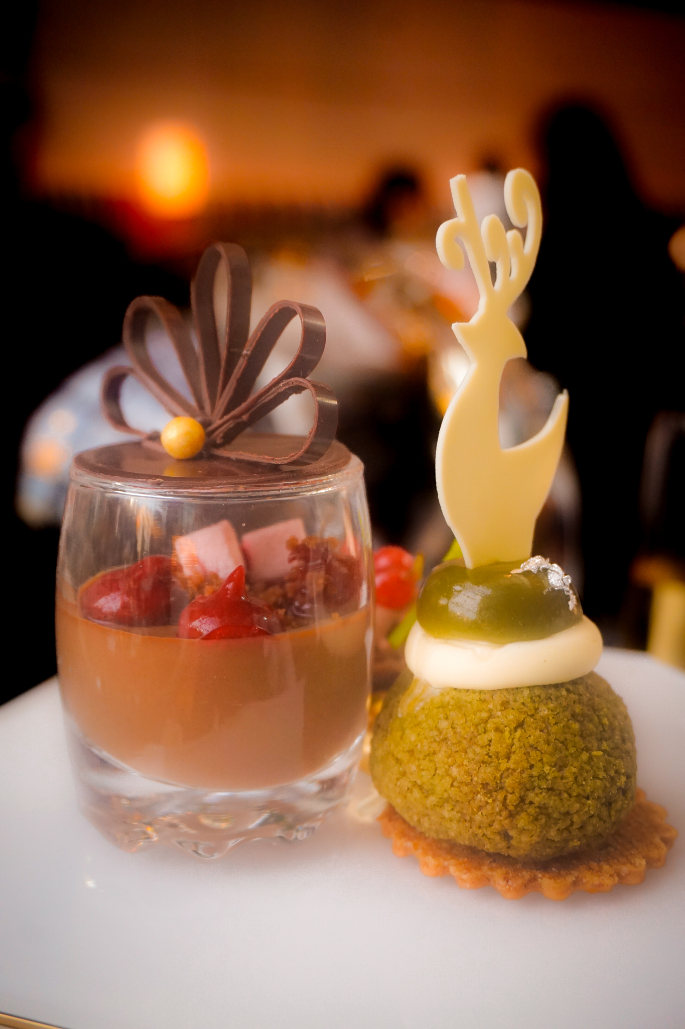 Short and sweet story: We have been to the Ritz Carlton before for afternoon tea, that is, almost a decade ago. See previous review here. Ten years later, dining at the Ritz Carlton still remains one of our most highly recommended dining place – the sweeping views 103 floors above ground level remain incomparable. So, when we heard that the hotel was serving up a Christmas High Tea, we did not hesitate to make a reservation. By contrast to Hotel Icon, you do need to eat something savoury before you partake in the afternoon tea at the Ritz Carlton. That’s because the savoury portion of the Ritz Carlton’s high tea comprises only three Lilliputian-sized morsels. Injected with fancy ingredients such as foie gras, snow crab, winter truffle, they were crafted with a delicacy reminiscent of a Michelin-starred restaurant, but were nonetheless, t-i-n-y. More memorable, and more generous in proportion, were the many Christmas-themed desserts. A striking red dome was festooned with a white chocolate ribbon and hid a heart of apple compote nestled within a gingerbread mousse; a black forest cake was decorated as a stout little Santa; a pink ballerina graced a white chocolate-coated cube of cassis mousse; slightly sour cream cheese reacted against the cloying sweetness of caramel inside a pretty snowflake white bauble; and a vibrantly-hued Christmas tree revealed layers of pistachio, kumquat and chocolate sable. Accompanied by endless tea and a platter of scone and cinamon and cloves-infused stollen bread, your Dessert Correspondents watched the sun set over Hong Kong Island. In short, tiny savoury bites aside, afternoon tea at the Ritz Carlton is a wonderful proposition for a peaceful end to a hectic pre-Christmas weekend.