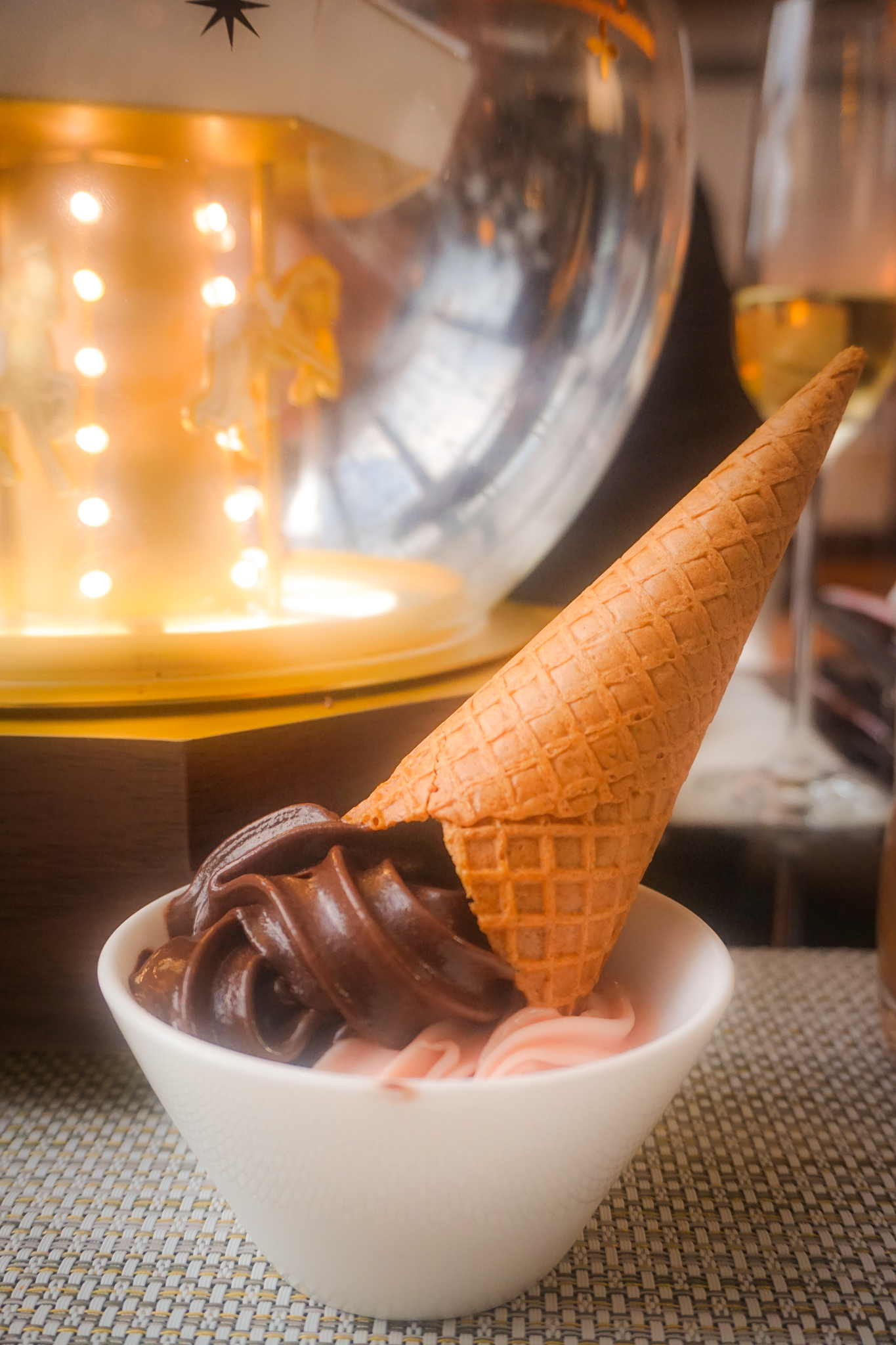 Short and sweet story: Located in the East TST district, Hotel Icon is a hotel with a distinctive boutique vibe. Afternoon tea is carried out in the lobby-level atrium area – it’s a large space with cathedral-high ceilings, albeit a very crowded spot, better for casual group gatherings than a place to impress and wow. Notwithstanding the down-to-earth setting, Hotel Icon’s Christmas afternoon tea will be etched in our memories for a long time. During our visit, afternoon tea was served as a three-course late lunch affair, where a platter of hors d’oeuvres was followed by a main course of prettily-plated steak. The highlight was, of course, the desserts, presented on a moving carousel rotating inside a giant glass globe speckled with gold stars. Such an extravagant display reminded us of high tea at the Mira a few months ago when we first arrived in Hong Kong. The sweets were all inflected with Godiva chocolate, and included pana cotta, cheesecake, choux puffs, tarts, and truffle chocolate bites. There was also an all-you-can-eat soft serve machine churning out thick swirls of very very rich Godiva chocolate ice cream and strawberry gelato.